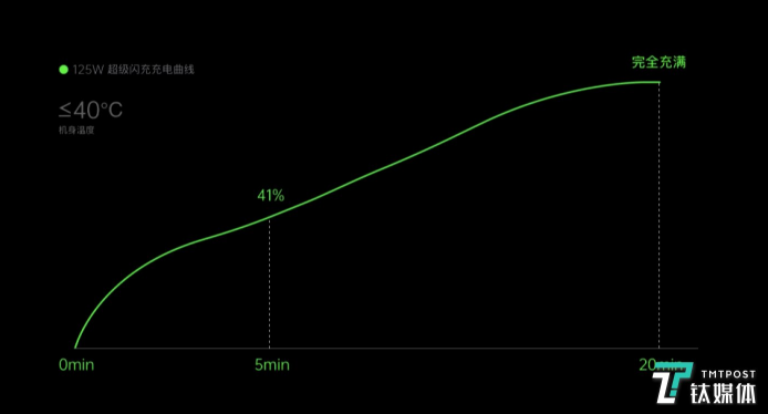 其中,vivo、小米、realme百瓦以上快充技術(shù)均表示在20分鐘內(nèi)充滿一部手機(jī)。而OPPO的125W超級閃充,5分鐘可將等效4000mAh電池的手機(jī)充至41%,20分鐘充滿。同時(shí),更將溫度嚴(yán)控在40度。而與各家不同的是,OPPO還同時(shí)推出了65W AirVOOC,在充電效率上已與此前最快有線充電速度不相伯仲, 30 分鐘充滿。